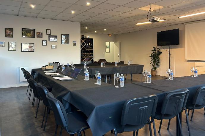Calme et aménagée avec un maximum de places assises c’est la salle idéale pour une réunion ou un comité de direction. Pour vos présentations d’entreprise profitez d’un vidéo projecteur, d’une télévision et d’un paperboard. La salle possède aussi sa propre cuisine avec frigo et matériel.